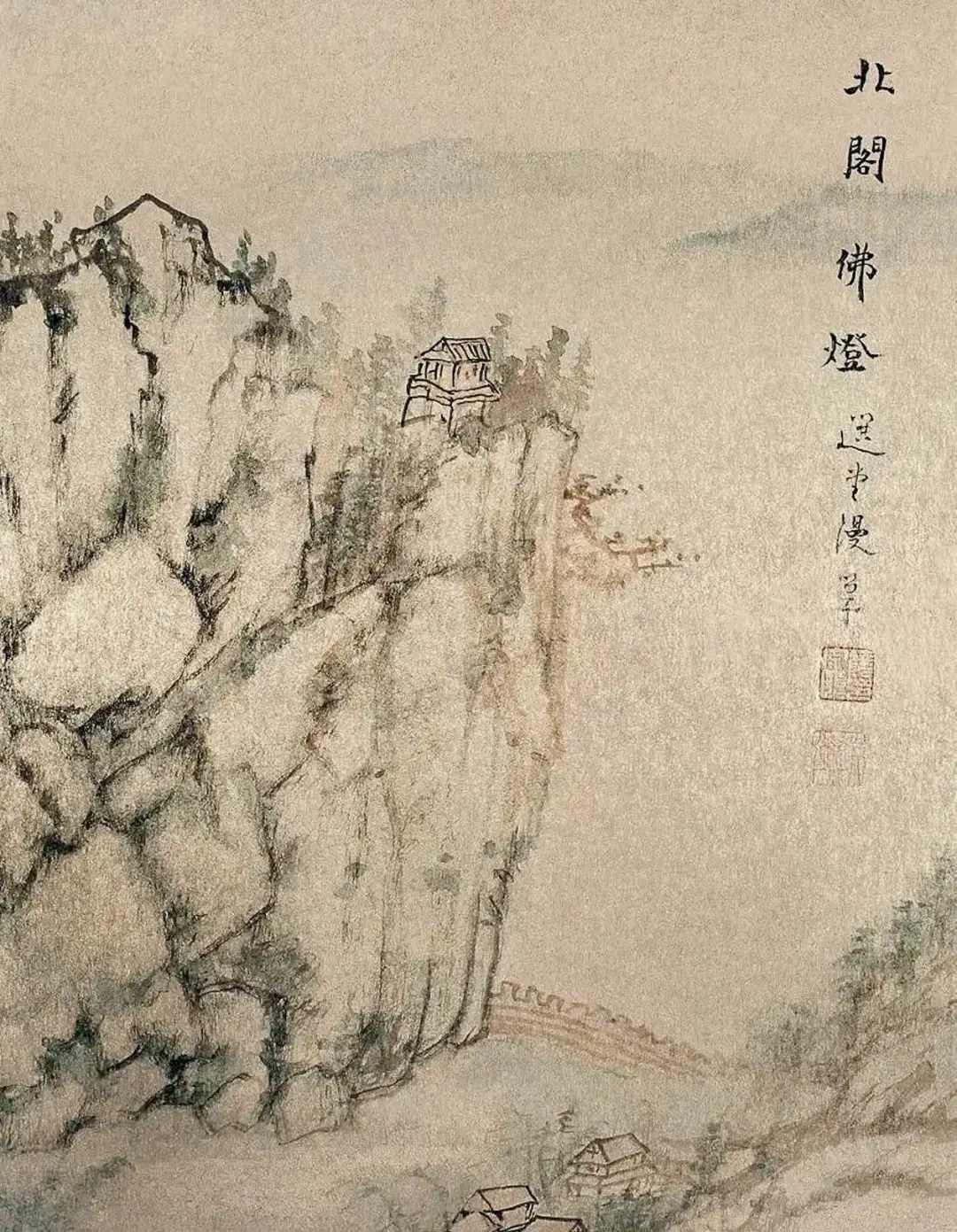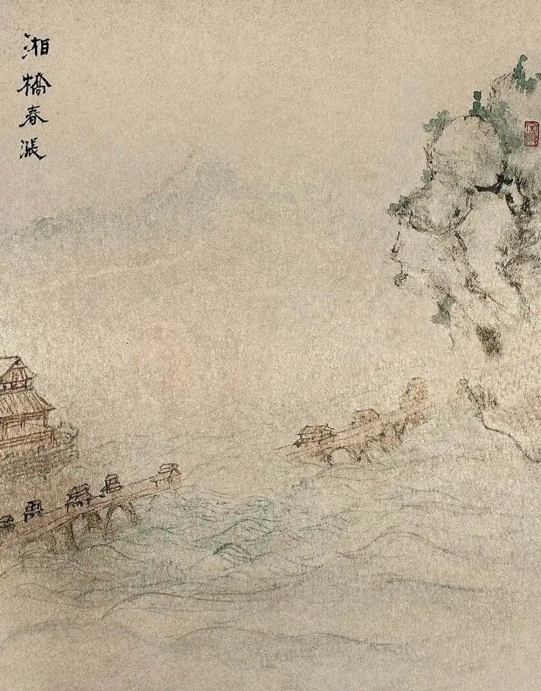 《北阁佛灯》的祥和光辉中,佛塔与江水构成垂直与水平的几何对话,而大面积留白则成为饶公精神世界的投射。这种"计白当黑"的东方美学,在《湘桥春涨》中演变为桥索与波光的虚实相生。当学术大儒的理性思维与文人画家的感性表达在此交汇,留白便不再是技法,而是饶公对"空与有"的哲学诠释——正如他晚年常言:"学问做到极致,终要还给天地一片空白。"