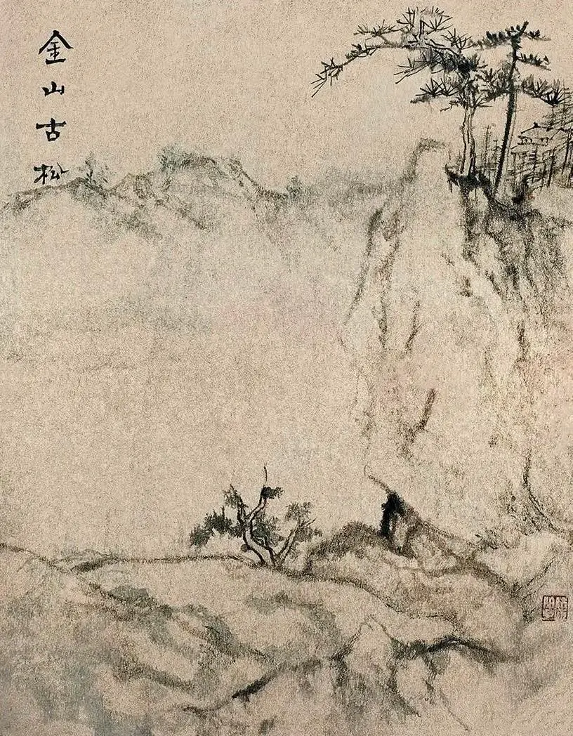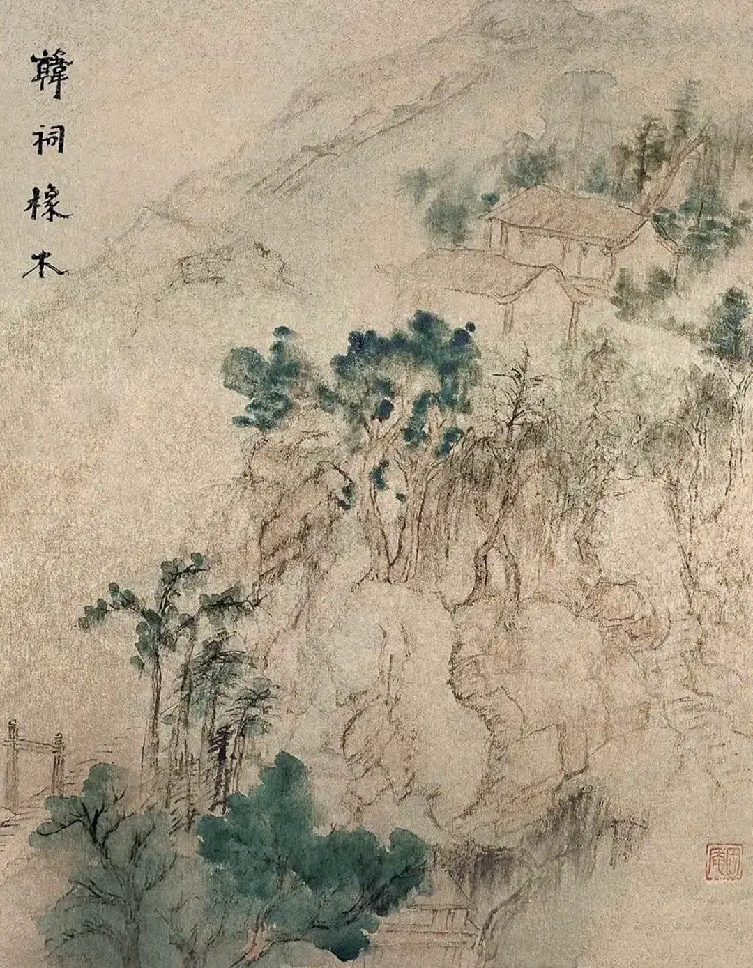 《韩祠橡木》中,饶宗颐刻意弱化橡木的具象形态,将韩文公祠置于画面制高点,石阶如历史脉络蜿蜒而上。这种处理暗合潮汕地区"祠堂高筑"的家族信仰,更以宋代小景画"登高怀古"的审美范式,将韩愈治潮的千年文脉浓缩于一隅。画面右下角若隐若现的宋代高士形象,恰似饶公借古人之眼,完成对文化根脉的深情凝视。